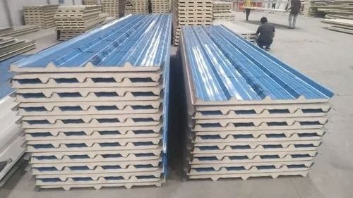 "World's Best Manufacturing Process with a continuous Production line for Sandwich PU/PIR Sandwich Panels." Metal-faced polyurethane sandwich panels are the system of choice today for large industrial buildings refrigerated warehouses, office blocks, exhibition halls, fair pavilions, schools, and sports halls. The aluminum or steel facings themselves are surface coated and can be manufactured with profiles of various depths leading to a higher load-bearing capacity. Polyurethane sandwich panels come complete with specially formed tongueand- groove joints ensuring a perfect fit and maximum integrity, Assembly is fast, easy, and cost-effective. As a result, these thin, relatively lightweight sandwich panels can safely bridge wide spans.